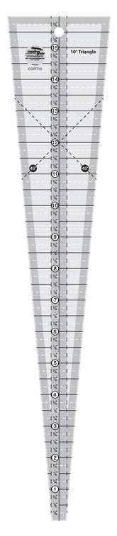 Creative Grids 10 Degree Triangle RulerSew together 36 of these 10 degree triangles to create a complete circle; 18 to create a half-circle; or 9 to create a quarter-circle. Create Fans, Dresden Plates, etc. up to a finished size of 31-1/2in. Total ruler length is 16in.The ruler slides easily...
