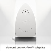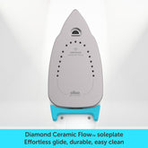 ProPlus turquoiseSimply touch the handle, and the iron lowers, ready to work. Take your hand off, and the iron lifts, preventing scorches, burns, and tipping. It’s not only safer, but also saves time as well as your wrists!The Diamond Ceramic Flow™ soleplate glides effortlessly over...