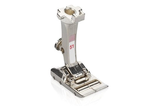 Roller Foot #51 ensures even fabric feed on difficult fabrics. Thanks to its rollers, it glides easily over “sticky” materials.