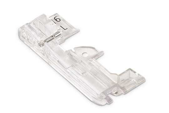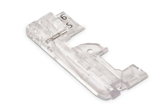 The transparent foot eases precise guiding of fabric, for example for sewing corners or circles.