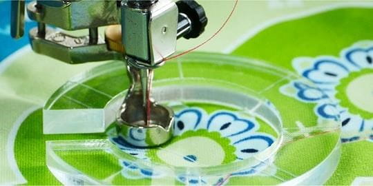 This foot allows you to sew along Plexiglas rulers to create decorative quilt designs such as lines, feathers, circles etc.