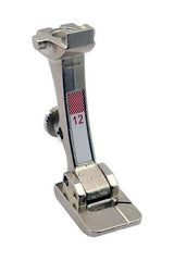 The BERNINA Bulky Overlock Foot #12 has a wide groove in the sole, making it ideal for sewing bulky knitted fabrics or for attaching leather strips. One side of the sole is longer than the other, allowing even thick and uneven fabrics to travel under it smoothly. The presser foot also has a guide hole for sewing over piping cord.