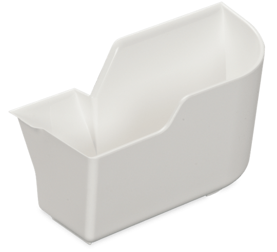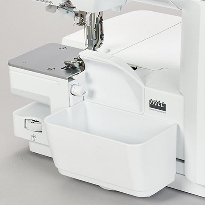 The cut-offs bin keeps the sewing table tidy. Simply click it on to the looper cover and dispose of fabric waste immediately after cutting. It can also be used to store the foot control.