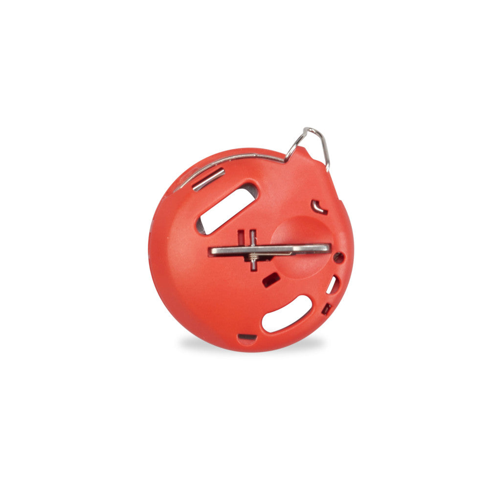 Great for under thread sewing or bobbinwork, this red bobbin case is found in the accessories catalog and marked by a small triangle. 034320.70.00 (New number: 034320.71.00)
