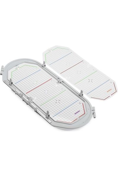 The mega embroidery frame (max. embroidery area 150 x 400 mm) is a professional grade hoop for embroidering extra-large embroidery designs, motif combinations and borders. It has three possible embroidery positions. As a result, the fabric can remain clamped in the frame after completion of the first embroidery area. This allows tidy and accurate working of uniform patterns without the formation of offsets or gaps. Thanks to the template that is included, the fabric can be precisely aligned.
