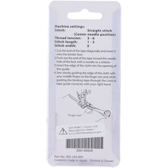 Snap-On Binder Foot, accommodates up to 1/4" bias tape using straight, zig zag or decorative stitches.