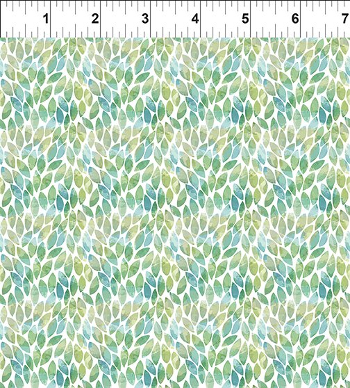 xLight blue and green leaves packed together on a white background. Fluttering beauty! Butterfly Fantasy by Jason Yenter for In the Beginning Fabrics is a charming fabric collection full of flowers, butterflies, and tiles. This collection will have your heart fluttering!