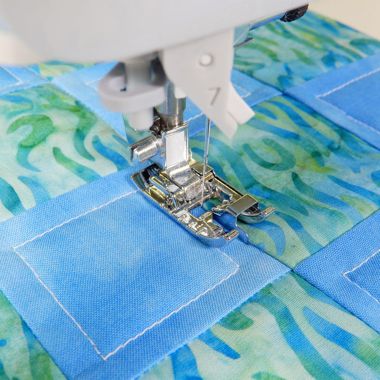 Designed with a shorter guide at its center, this presser foot ensures a smoother fabric feed and helps minimize uneven feeding. The markings on the left side of the foot serve as a helpful guide for outline quilting. Additionally, by adjusting the needle's baseline, you can effortlessly achieve precise single lap stitching.