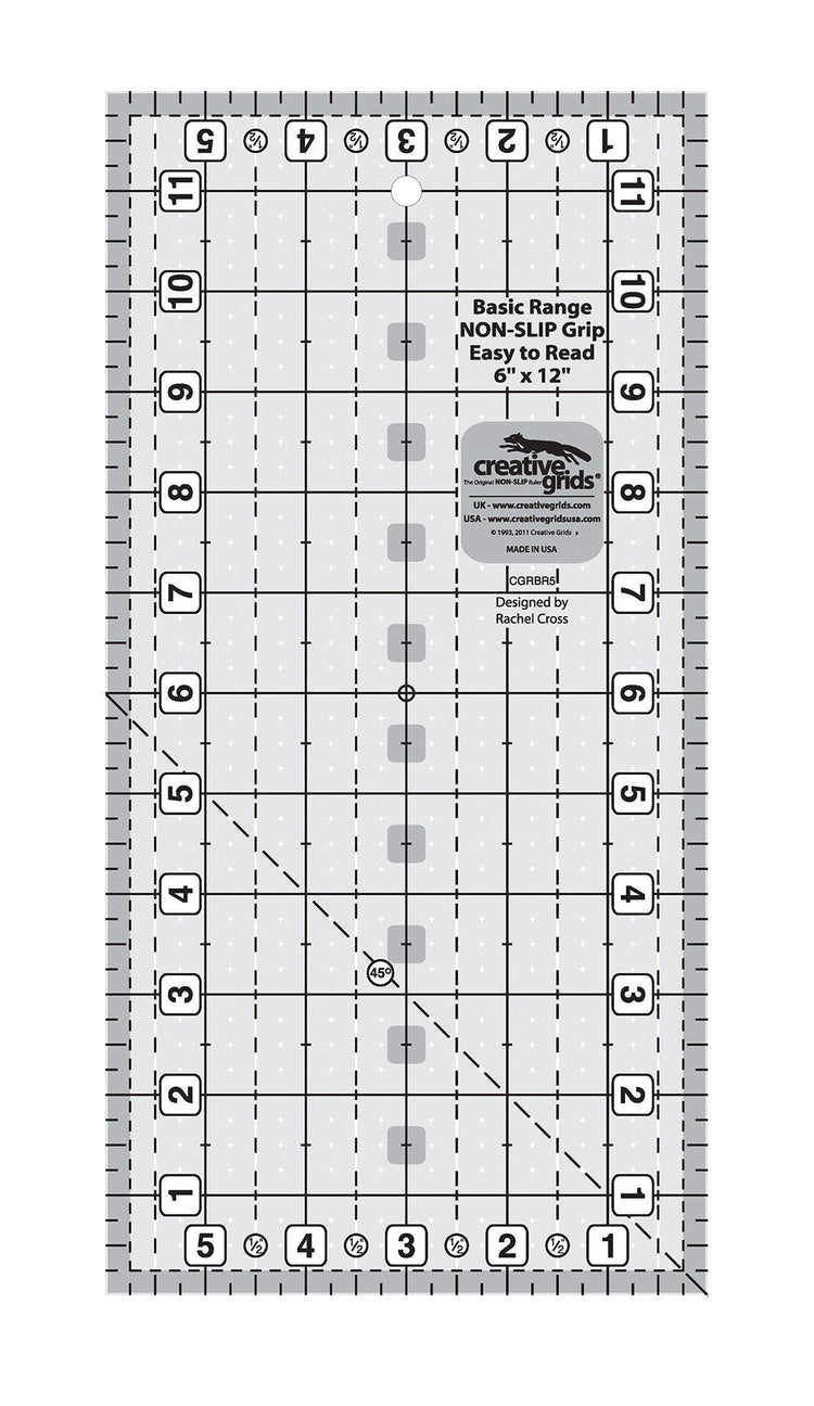 Keep it simple! The Basic Range series does just that – they are easy to see and easy to read. By eliminating the 1/8 inch markings and the Turn a Round feature, literally over half of the markings are removed. The remaining 1/4 inch; 1/2 inch and 1 inch markings are printed with a whole inch grid. That’s right – without the Turn a Round feature, a 6 x 12 inch ruler truly measures 6 x 12 inches – not 6-1/2 x 12-1/2 inches. Therefore they are printed so they read correctly for left handers too! This 6 x 12 inch rectangle features black numbers printed on white squares that are easy to read and differentiate this series from our standard line. Since 1/2 inch cuts are the most frequently used, these black and white dashed lines are prominent and are visible on light AND dark fabrics. Use the 45 degree angle to square up half-square triangles in whole and half inch increments.