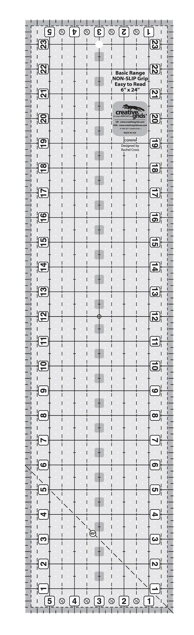 Keep it simple! The Basic Range series does just that – they are easy to see and easy to read. By eliminating the 1/8 inch markings and the Turn-a-Round feature, literally over half of the markings are removed. The remaining 1/4 inch; 1/2 inch and 1 inch markings are printed with a whole inch grid. That’s right – without the Turn a Round feature, a 6 x 24 inch ruler truly measures 6 x 24 inches – not 6-1/2 x 24-1/2 inches. Therefore they are printed so they read correctly for left handers too! This 6 x 24 inch rectangle features black numbers printed on white squares that are easy to read and differentiate this series from our standard line. Since 1/2 inch cuts are the most frequently used, these black and white dashed lines are prominent and are visible on light AND dark fabrics. Use the 45 degree angle to square up half-square triangles in whole and half inch increments.