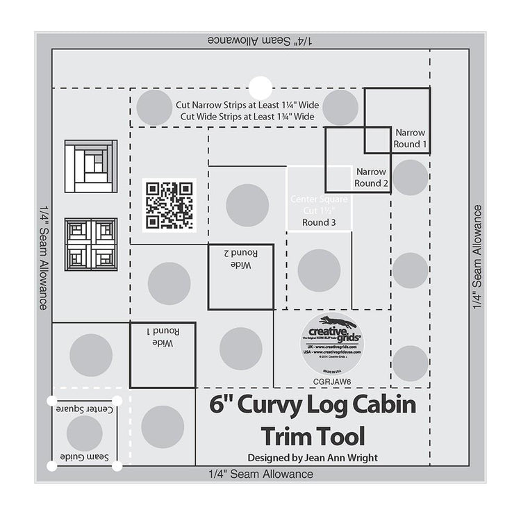 Create the illusion of curves with this 6 inch version of our popular Curvy Log Cabin Trim Tool. Mark the wrong side of the center square through the holes on the ruler to ensure a perfect seam allowance. Then sew a round – two narrow strips and two wide strips and trim. Add two more rounds to complete a perfect 6 inch finished block. Sew four blocks together to “piece” a circle which finishes to 12 inches. Combine these blocks with traditional 6 or 12 inch log cabin blocks created with the Creative Grids Log Cabin Trim Tool Two (CGRJAW2) or the six inch Log Cabin Trim Tool (Item CGRJAW6MN) for unlimited design potential.