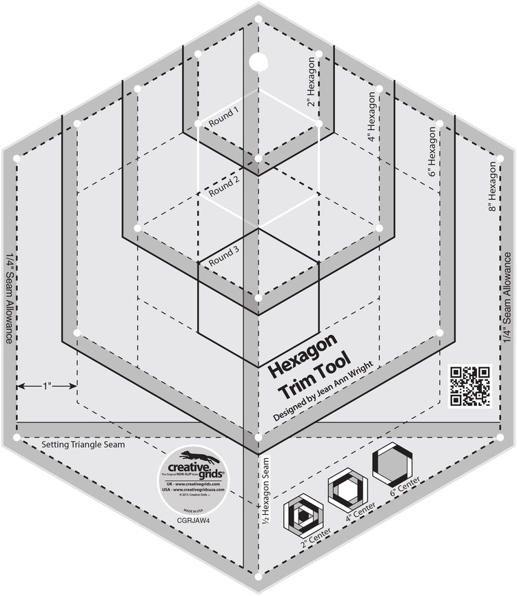 Create perfect pieced hexagons with 2, 4, or 6 inch finished centers by squaring up each round of strips as you go. Since each round is squared up before the next set is added, the blocks created are perfect hexagons. Or use the markings to cut 2 to 8 inch finished hexagons and every even size in between. Note: This tool cuts finished hexagons that measure 8 inches from side to side. From point to point, the cut hexagon is slightly less than 10 inches so they can be cut from 10 inch pre-cuts. Pattern requires inset seams? No problem - use the drilled holes to mark the seam allowance. Want to cut half hexies to avoid inset seams? The markings for half hexies are includes as well.