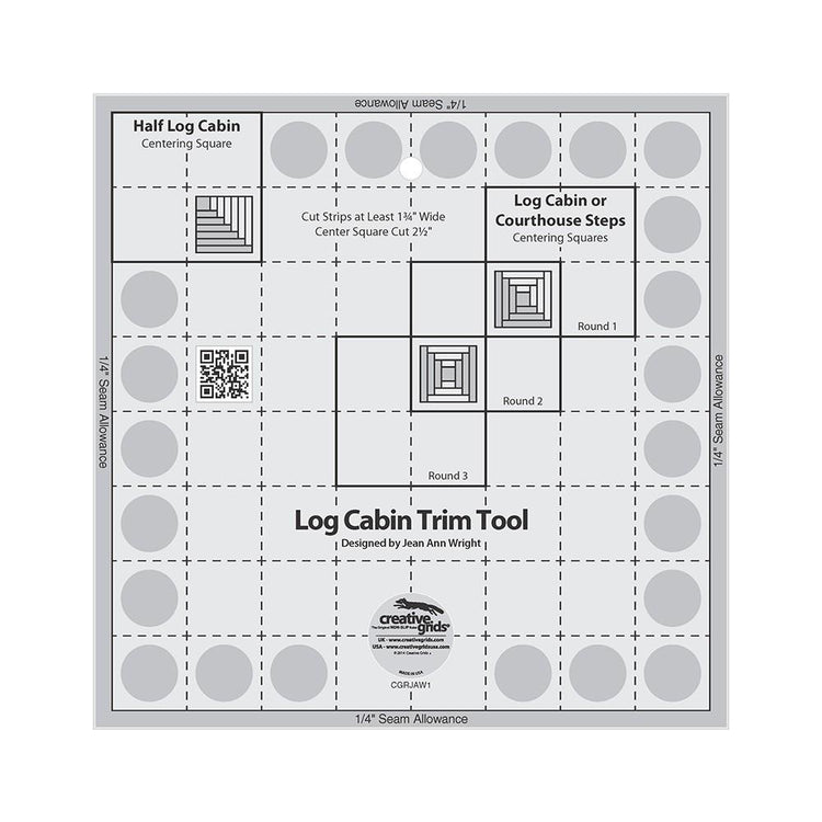 The 8 inch Log Cabin Trim Tool features exclusive markings to create perfect finished Log Cabin; Half Log Cabin; or Courthouse Steps blocks. After adding each round of “logs”, place the appropriate centering square on the tool over the center square and trim. Since each round is squared up before the next set of logs are added, the results are spectacular. The cutting requirements for the strip widths and center square are printed right on the tool! Combine these blocks with eight inch curvy log cabin blocks created with the Creative Grids Curvy Log Cabin Trim Tool (CGRJAW5) for unlimited design potential.