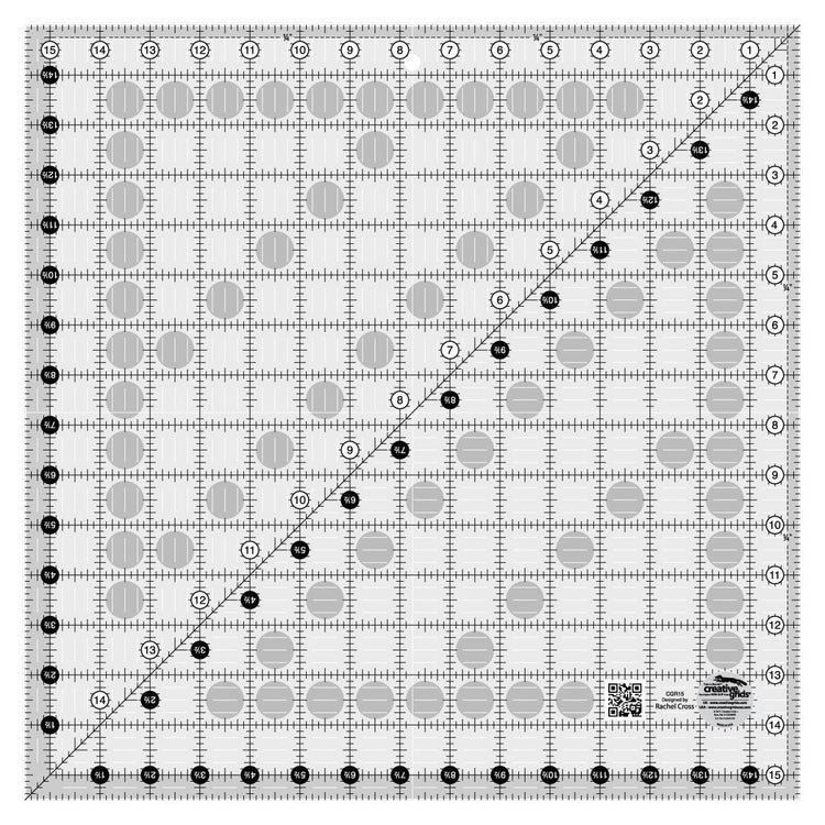 This 15-1/2 inch square features easy-to-read black and white markings printed in 1 inch grids marked in 1/8 and 1/4 inch increments. Use the easy-to-read, black numbers (printed on white dots) and the 1/4 inch grip sides to cut whole inches. The 1/4 inch dashed lines printed on two adjoining sides aid in trimming seam allowances. Use the patented Turn-A-Round feature – designated by the easy to read, numerical white numbers (printed on black dots) and the 1/2 inch grip sides – to add the 1/2 inch seam allowance. A 45 degree angle is printed in black and is used to trim half-square triangles to size. White horizontal and vertical lines are printed on the square so the center of the ruler is easily distinguishable. Use these lines to square up blocks based on four-patches or embroidered and appliqued blocks.
