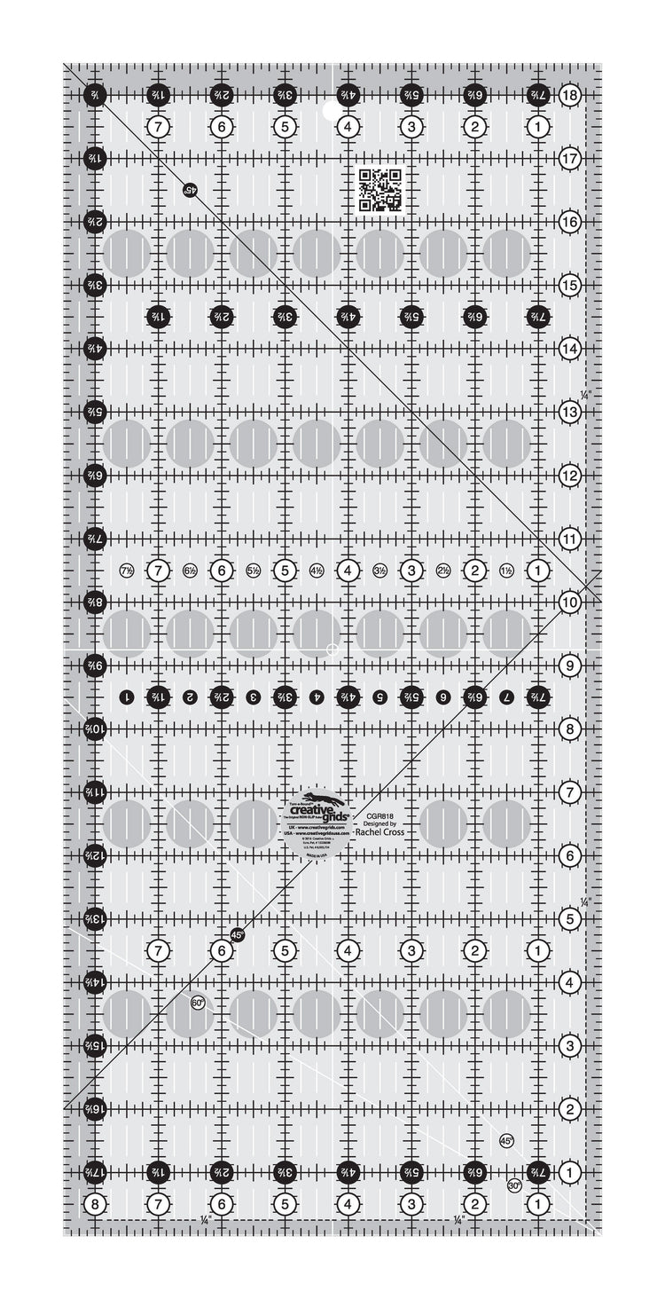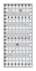 This 8-1/2 x 18-1/2 inch rectangle ruler is a workhorse. It is the perfect size to span the most popular size of rotary cutting mats. And, since it is 25% smaller than the original 24-1/2 inch version, it is easier to manipulate. The wide width makes it the perfect choice to square up corners and borders. It features easy-to-read black and white markings printed in 1in grids marked in 1/8 and 1/4 inch increments. Use the black numbers (printed on white dots) and the 1/4 inch grip sides to cut whole inches, while the white numbers (printed on black dots) and the 1/2 inch grip sides add the 1/2 inch seam allowance. Use the white 45 degree angle to trim half-square triangles in whole inch increments. Use the black 45 degree angle to trim half-square triangles in half inch increments. An additional black 45 degree line is placed so that two angles cross 1/4 inch away from the outside edge. Use these markings to square up flying geese units; squares set on point or mark cross-hatching. The ruler also features a 30 and 60 degree angle. White horizontal and vertical lines are printed on the rectangle so the center of the ruler is easily distinguishable. Use these lines to fussy cut stripes and borders.