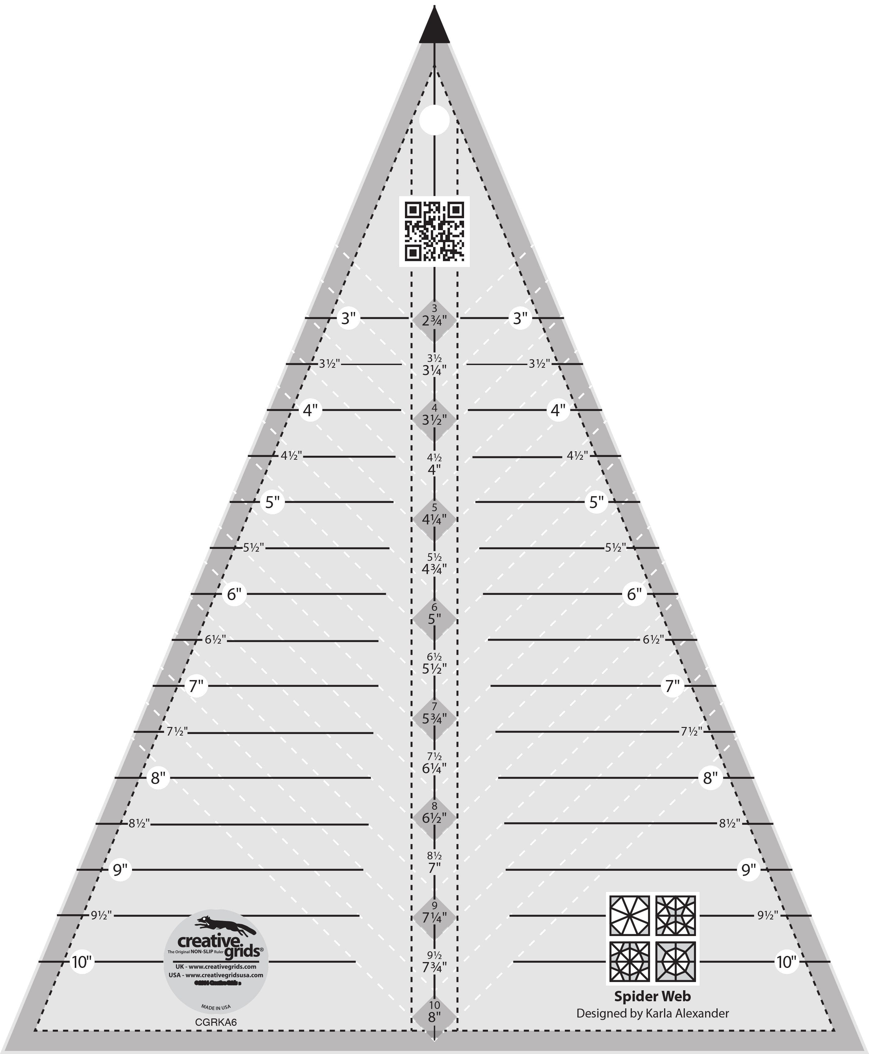 This double duty 45 degree Spider Web ruler creates a variety of blocks using 3 to 10 inch strips or strata widths. Once you have cut the triangles, reposition the ruler to cut the background kite and/or corner shapes. Depending on the positioning of the light and dark fabrics, the finished blocks resemble a spider web or a four-pointed star.