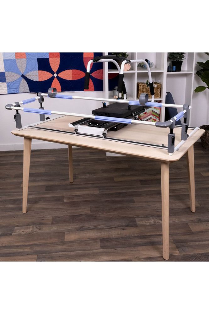 One of the biggest selling points for Grace's Tabletop Frame is its compact size. Instead of having a dedicated space for quilting like with traditional 8, 10, or 12-foot frames, the Breeze can easily work in any room. The Breeze Frame quickly moves from the table to the counter or a desk, depending on when you want it. To better fit your project and room, the frame even has adjustable rail height and depth. Measuring approximately 52" wide by 40" deep by 23" tall (fully extended), the Breeze is designed to fit your space. Please note the Cutie Legs are NOT compatible with the Breeze.