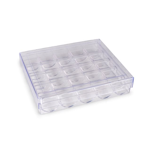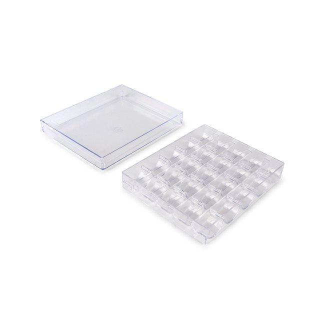 Keep your sewing supplies organized with the Dritz 25 Bobbin Box. This clear box holds 25 regular-sized bobbins, allowing you to easily see and access your thread colors. The lid conveniently fits on the bottom when open, and each compartment measures 15/16" x 5/8" x 3/4".