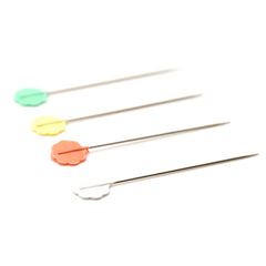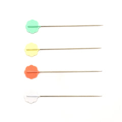 Flower Head Pins are good for general pinning. Especially useful for pinning lace, eyelets, loosely woven embellishments. These pins hold together many layers of fabric. The flat head is convenient for machine stitching.
