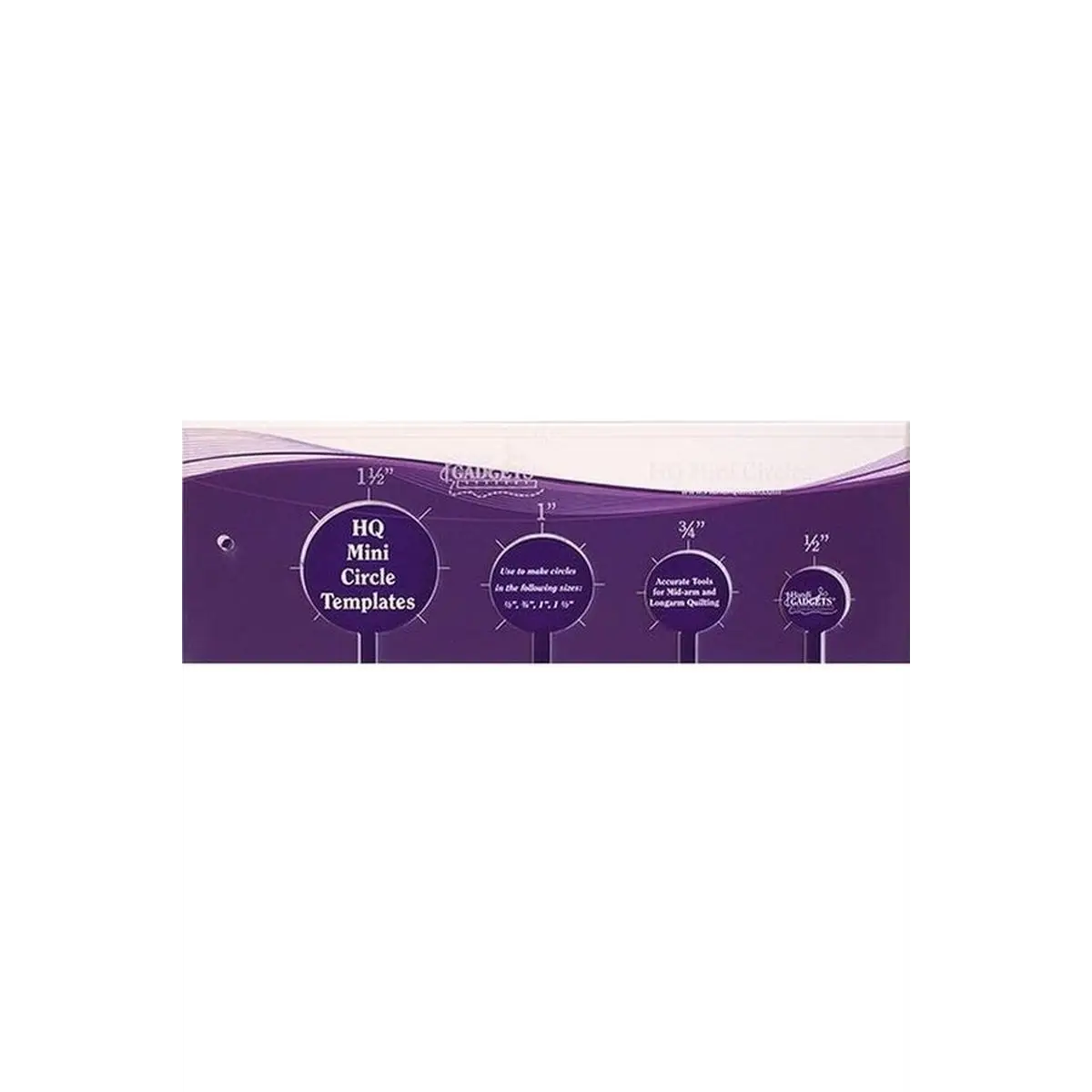 Règle-Mini Cercles. Fabriqué à partir d'acrylique de qualité de 0,25 pouce d'épaisseur. Ce modèle a été conçu avec des fentes menant à chaque cercle afin qu'il fonctionne pour toutes les machines à bras moyen et long qui ont un pied sautillant. L'emballage comprend des instructions d'utilisation, des conseils de sécurité et des idées de conception. À utiliser avec la base de règle HQ.