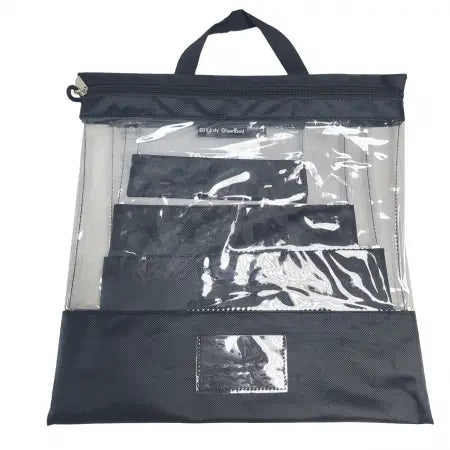 Four clear organizing bags in the set.Dimension:14.9"L x 15.9"H x 0.2"D12.5"L x 11.6"H x 0.2"D10.75"L x 9.25"H x 0.2"D5.5"L x 8.5"H x 0.2"DFeatures• Transparent storage bag with clear vinyl window.• Can see your stuffs easily with a zipper closure at the top front and top handles for easy carrying.• Quality nylon fabric on the top and bottom.• Good for keeping tools: rotary cutter, Gingher scissors, small scissors, various rulers, seam ripper, marking pencil, embellishment & needle craft, thread, bobbins, needle cases, rotary blade cases, peep hole etc.WARNING: Cancer and Reproductive Harm – www.P65Warnings.ca.gov Made of: Vinyl, Metal & Nylon Color: Black Use: Bag