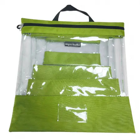 Four clear organizing bags in the set.Dimension:14.9"L x 15.9"H x 0.2"D12.5"L x 11.6"H x 0.2"D10.75"L x 9.25"H x 0.2"D5.5"L x 8.5"H x 0.2"DFeatures• Transparent storage bag with clear vinyl window.• Can see your stuffs easily with a zipper closure at the top front and top handles for easy carrying.• Quality nylon fabric on the top and bottom.• Good for keeping tools: rotary cutter, Gingher scissors, small scissors, various rulers, seam ripper, marking pencil, embellishment & needle craft, thread, bobbins, needle cases, rotary blade cases, peep hole etc.WARNING: Cancer and Reproductive Harm – www.P65Warnings.ca.gov Made of: Vinyl, Metal & Nylon Color: Green Use: Bag