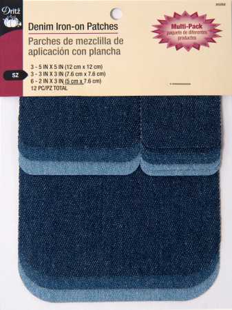 ar, hole or worn area. Use to repair garments, accessories, or other fabric items. Use templates or stencils to cut patterns and shapes for kids’ clothing repairs or just to make a fashion statement! Simple iron-on application means no sewing. Packages contains a total of 12 patches in assorted denim colors: dark blue, faded blue and stonewash; Sizes: (3) 5in x 5in, (3) 3in x 3in, and (6) 2in x 3in. Washable and dry cleanable. Color: Blue Use: Iron On Patches Size: 5in x 5in, 3in x 3in, and 2in x 3in Included: 12 Patches
