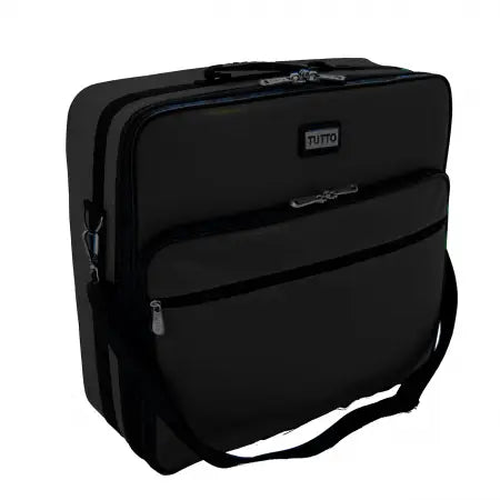 Holds embroidery unit, hoops, fabric, computer supplies, and fills pockets with sewing notions to your heart content. The black top board can double use as a design wall, great for blocks. Interior:19"L x 17"H x 5.5"DExterior: 20"L x 18"H x 6"DFeatures Ultimate Protection: The walls are lined with durable honeycomb board & padded with high density cell foams. Two inside straps to secure your embroidery unit.Great companion bag: Carry individually with handle or shoulder strap. Also can stack on top of Tutto Serger Sewing Machine Bag and Sewing Machine Bag.WARNING: Cancer and Reproductive Harm - www.P65Warnings.ca.gov Color: Black Made of: Plastic & Nylon Use: Bag Size: 20in x 18in x 6in Included: One Bag