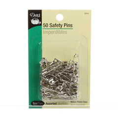 se. Pins are rust resistant. Contains an assortment of size 1and 2 safety pins. Nickel plated steel. Made of: Metal Use: Safety Pins Size: 1/2in Included: 50 Pins