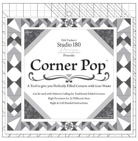 xFinally, a tool and technique that will give you high success adding fabric corners to basic shapes. For years we’ve been layering small squares on big squares, marking & stitching on a diagonal line, then hoping everything lines up when we fold the small corner section back into place. If you’ve tried it, you know the pitfalls: too big, too short, too crooked and way too wasteful. No more. With your new Corner Pop tool, you will be able to trim rather than mark, add an oversized replacement triangle and then square everything to a perfect size. In twenty two different sizes - whole, half and quarter inches. Increased success without undue stress for every level of quilter. What’s not to love! Color: Clear Made of: Acrylic Use: Quilting Template Size: 9.5in x 9.5in