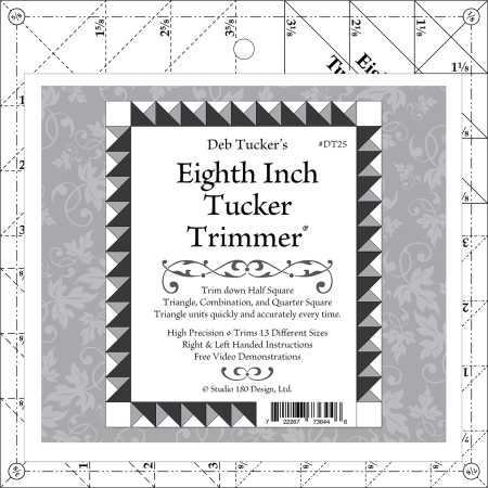 xThe Eighth Inch Tucker Trimmer trims down 13 different unit sizes in 1/8in, 3/8in, 5/8in & 7/8in increments. For all the times when you just have to trim to an 1/8in increment. Use it to quickly and accurately trim down units that are made with triangles: half square triangle squares, quarter square triangle squares (hourglass units), and combinations of half square and quarter square triangle squares (combination units). It has multiple diagonals which allow you to align ruler guide lines with unit seam lines to quickly locate the exact center of pieced units. This makes unit construction easy, precise and perfect every time and it’s also handy for cutting those squares from strips. It is compact, simple to read, and provides the same great results you've come to expect from all Studio 180 Design tools. It is the perfect tool for those who prefer to make quilts using smaller units!Details -Ruler Size: 7-1/2in x 7-1/2in-Thirteen unit size options from 1/8 finished to 3-3/8in finished in 1/8in increments (trim sizes 7/8in to 3-7/8in)-Step by Step illustrated instructions included for making half square triangle, hourglass and combination units. Now available to download! -Instructions illustrated for left handed trimming-Charts for easy conversion of other pattern instructions -Free online videos for unit construction and trim down (coming soon)-Item #DT25 Color: Clear Made of: Acrylic Use: Quilting Template Size: 7-1/2in x 7-1/2in