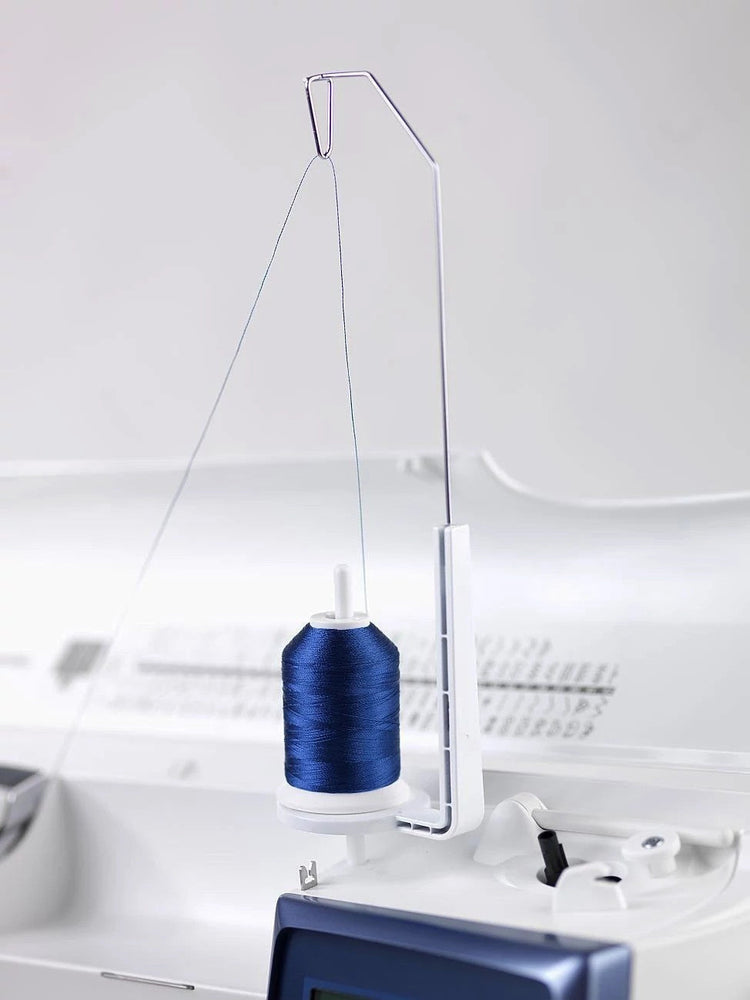The Mega Spool Stand is an accessory to make it easier to use large spools of decorative thread. The stand is mounted on the top of the sewing machine and includes the actual thread stand, a thread guide and a thread net.