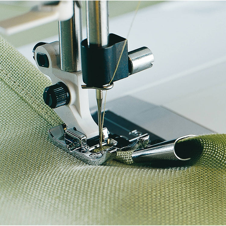 Quickly and evenly sew a 10 mm double or rolled hem in light to medium weight fabrics. Simply guide it after inserting your fabric, as the foot does all the work.