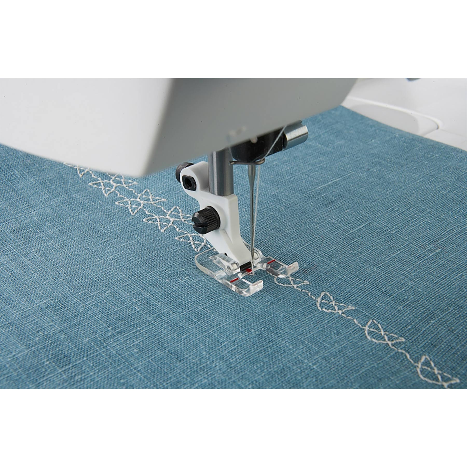 Sew taper stitches, satin stitch applique, and decorative stitches easily. The clear view through the foot makes it easy to match rows of stitches perfectly. The tunnel on the underside of the foot feeds smoothly plus the clear view and open front gives greater visibility and a great overview of the stitches.