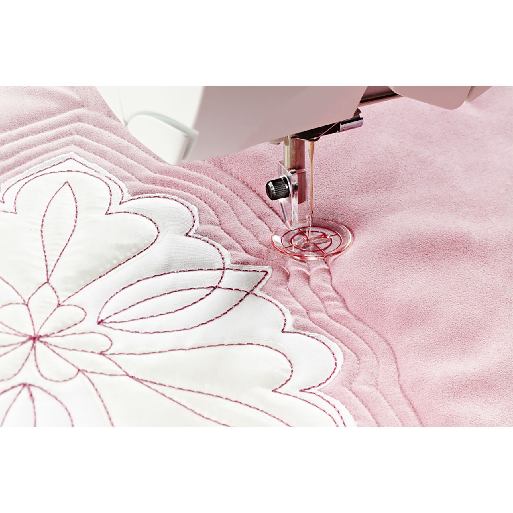 The Free Motion Echo Quilting Presser Foot is designed to give you more control when free-motion quilting. The large base ensures good surface contact with the fabric and provides better control of the stitching and 360° visibility. Vertical, horizontal and circular markings on the foot make it easy to follow a continuous line, quilting pattern, or design on the fabric. Sew straight lines or follow patterns with rounded edges in any direction.