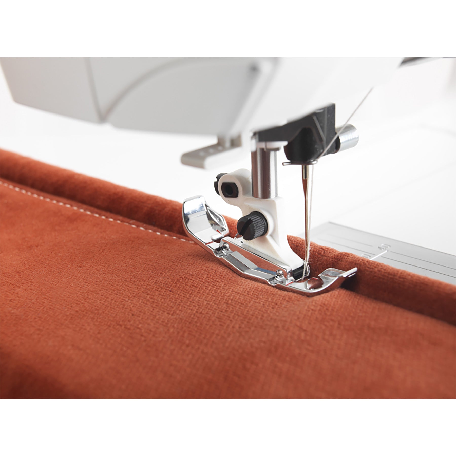 The Mega Piping Foot is perfect for inserting thick home dec piping into seams and on edges for a tailored finish. The trim is sewn between the two layers of fabric in one step. You can also create your own piping for a custom finish. This foot can be snapped on to the right or the left of the needle which makes it possible to both create and sew the piping into the seam and to beautifully topstitch along the piping.