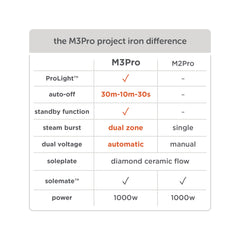 With the smooth Diamond Ceramic-Flow™ soleplate, detailer tip, and dual steam, the M3Pro presses flat seams and impeccably sharp creases, efficiently removing wrinkles.
