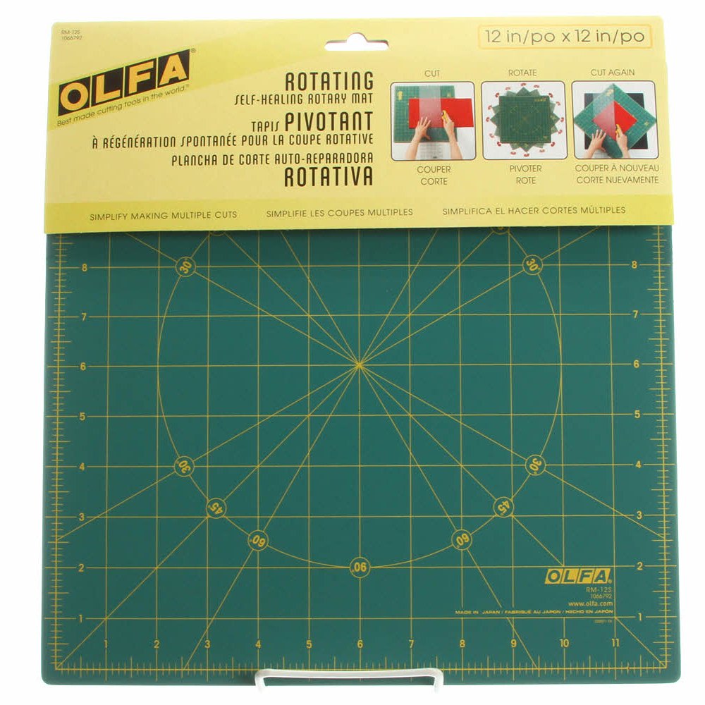 Self-healing, green rotating rotary mat rotates 360 º smoothly, eliminating the need to move your body or your project around - just cut, rotate mat, and cut again! Easily make 30 º, 45 º, 60 º and 90 º cuts. Non-slip back for stable and safe cutting. Lightweight. 12"x 12"