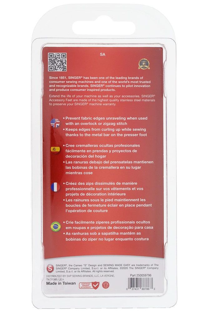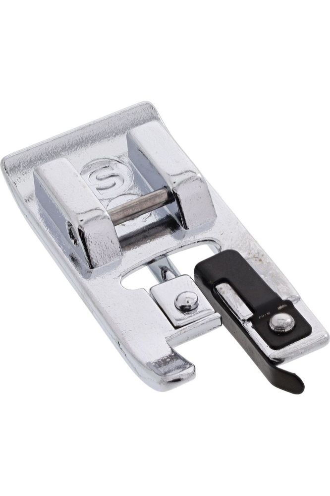 The Overcasting Foot is used to keep the fabric edges from curling up when you overlock or zigzag stitch. The metal bar in the center of the foot holds the fabric flat as the thread wraps over the edge for a serged effect.