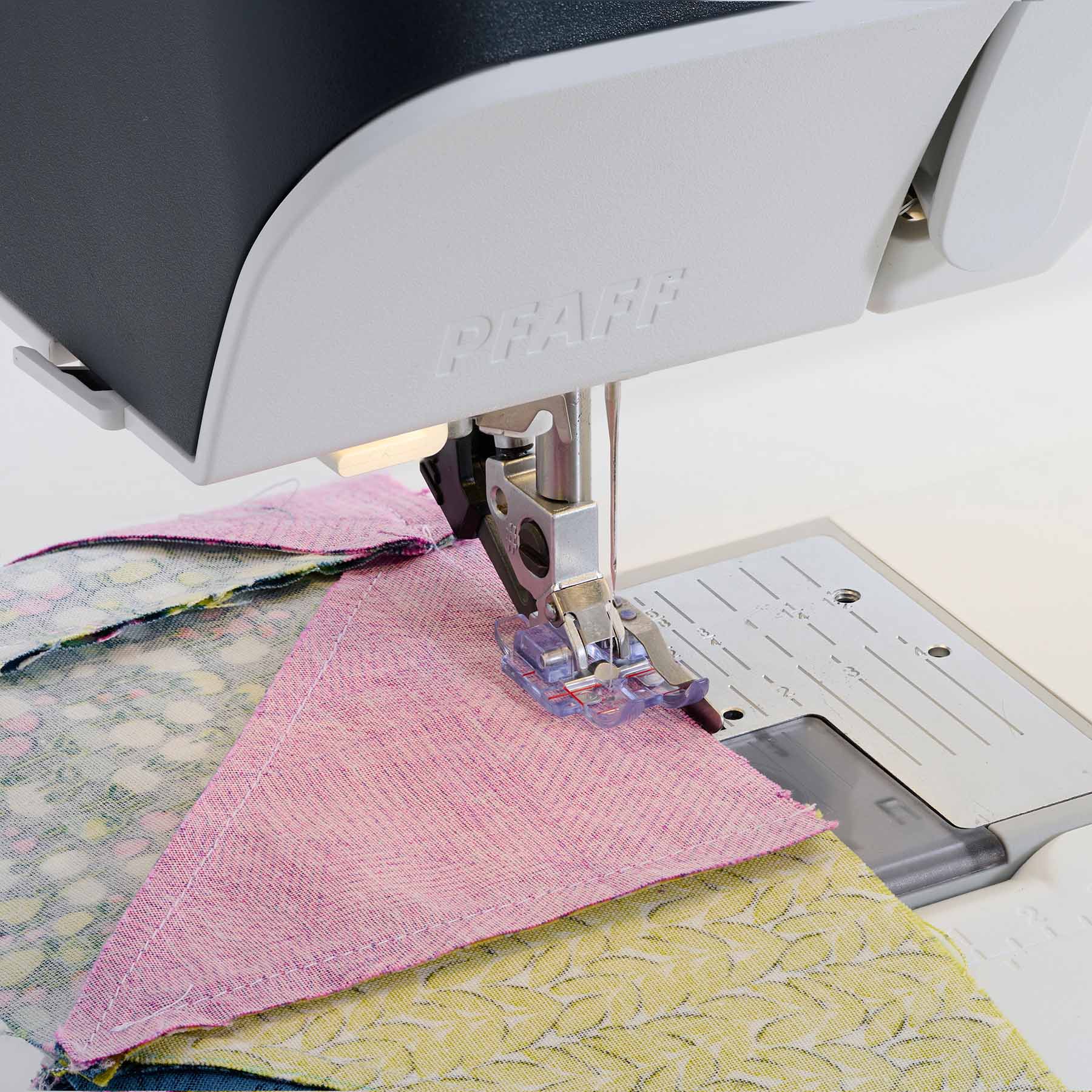 Designed to help you achieve perfect 1/4" pieced seams. Simply guide the fabric edge next to the guide. The distance between the needle and the right guide is 1/4 inch.