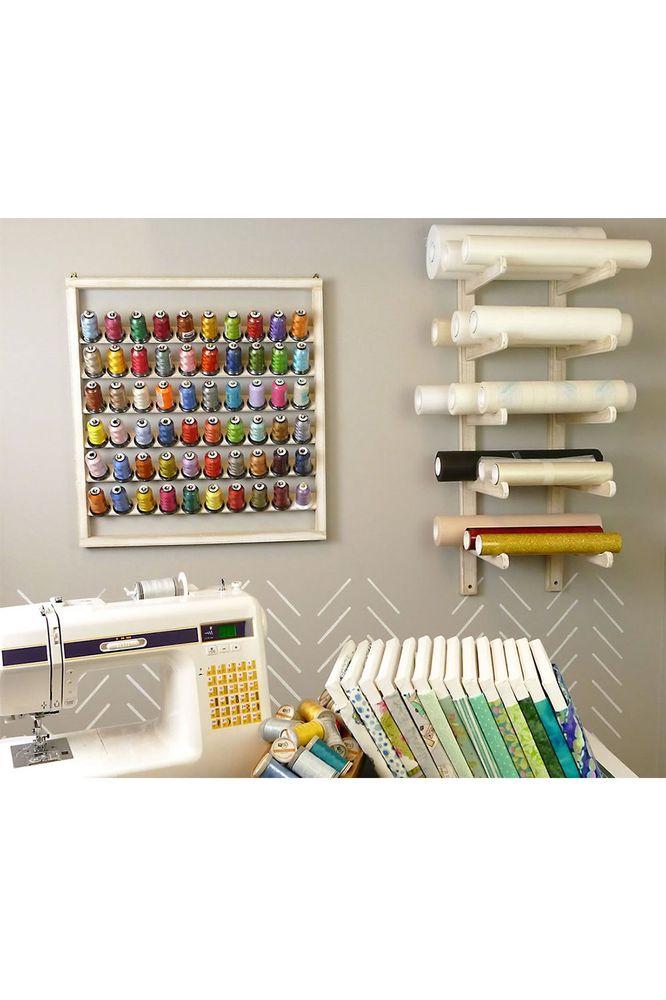 Clean up your sewing area with the help of RNK's Easy Access Stabilizer Rack. These racks have rounded edges to prevent tearing of your stabilizer, vinyl, or any other material. You can store up to 15 rolls of varying sizes with these handy storage racks. You'll need approximately 33-1/2" of vertical space to hang the Easy Access Stabilizer Rack. Included in the box, you get two pre-assembled wood rack pieces, four wall screws, and four wall anchors.