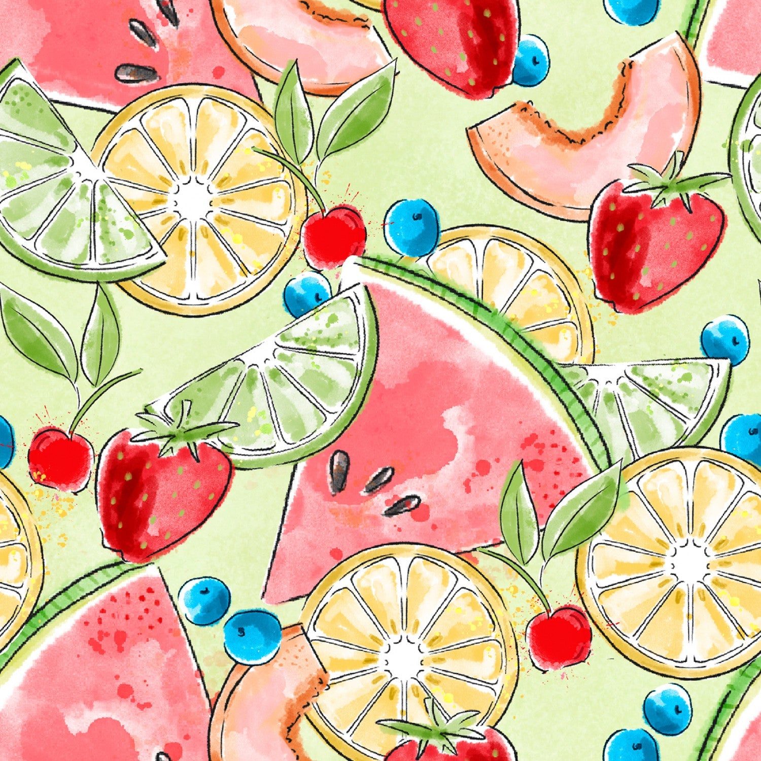 Sweet Summertime | Tossed Fruit Green by Duncan MacDougal for 3 Wishes (Sold By 1/2 Meter)
