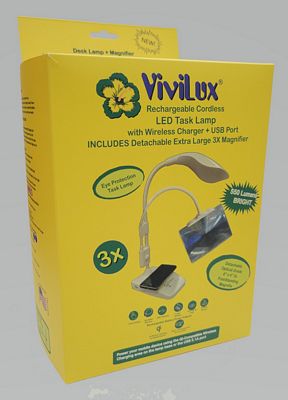 Package includes ViviLux Rechargeable Battery Task Lamp, USB cord, and Wall plug. Magnifier includes Connectors to Task Lamp, Base for freestanding use, flexible arm, and 6inx4in 3x Optical Grade Magnifier. Our #1 requested add-on - a Magnifier for our Rechargeable Battery Task Lamp. This package includes BOTH Desk Lamp AND Magnifier. Not just any magnifier -- we have added the features you need as the perfect addition for your craft needs. In addition to our Rechargeable Battery Task Lamp with Wireless Charger and USB charging port, you get: 6in x 4in Optical Grade Magnifier (most companies only sell 2x magnification) Flexible arm so the magnifier can be positioned exactly where you need it. Clips to attach directly to the Task Lamp. Extra base, so the magnifier can be used freestanding, independent of the Task Lamp.