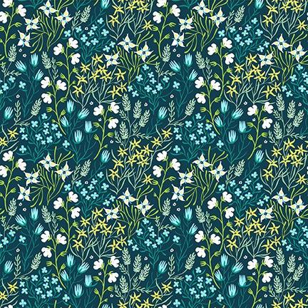 The Whimsy collection features elegant floral patterns and foliage in a serene blend of green blue, teal, and neutral hues, ideal for enhancing the appeal of your playful sewing projects for a magical feel.
