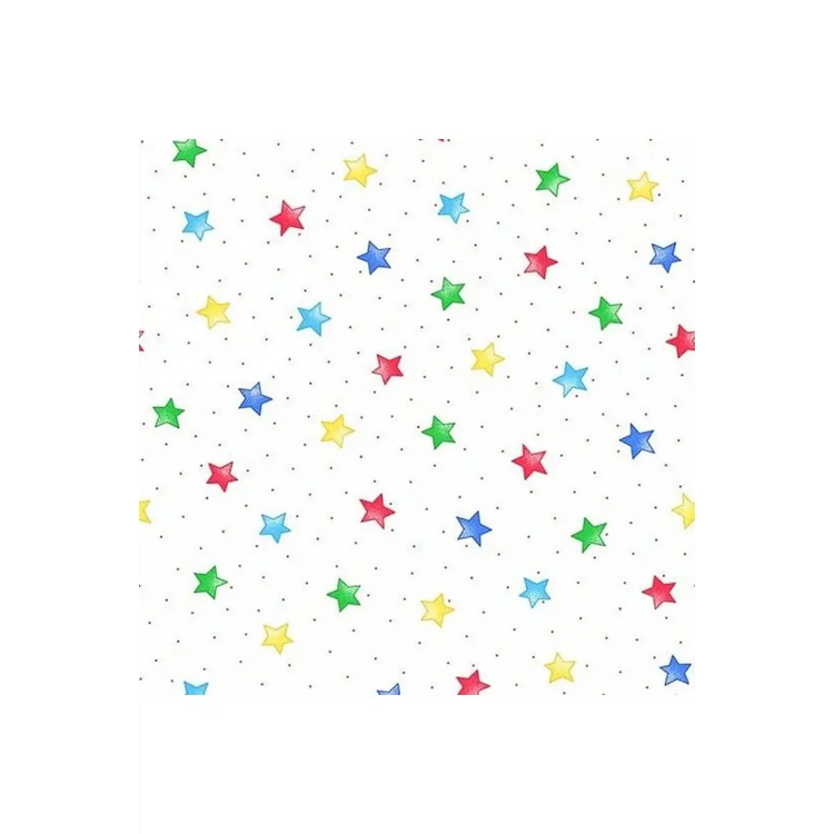 White background with multicolored primary stars in light blue, dark blue, yellow, red, and green with little red dots.