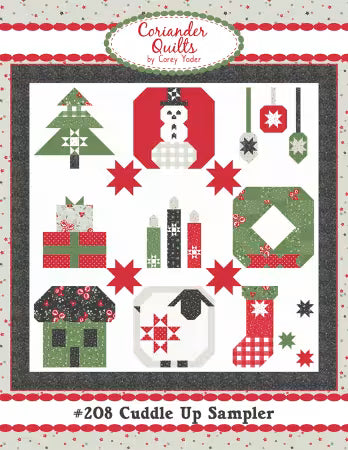 The Cuddle Up Sampler quilt pattern, created by Corey Yoder of Coriander Quilts, measures 70" x 70" when finished. It showcases her Starberry fabric collection for Moda fabrics and is suited for intermediate quilters. This pattern comes as a 21-page booklet (8 1/2" x 11") featuring full-color cutting diagrams and detailed illustrations.