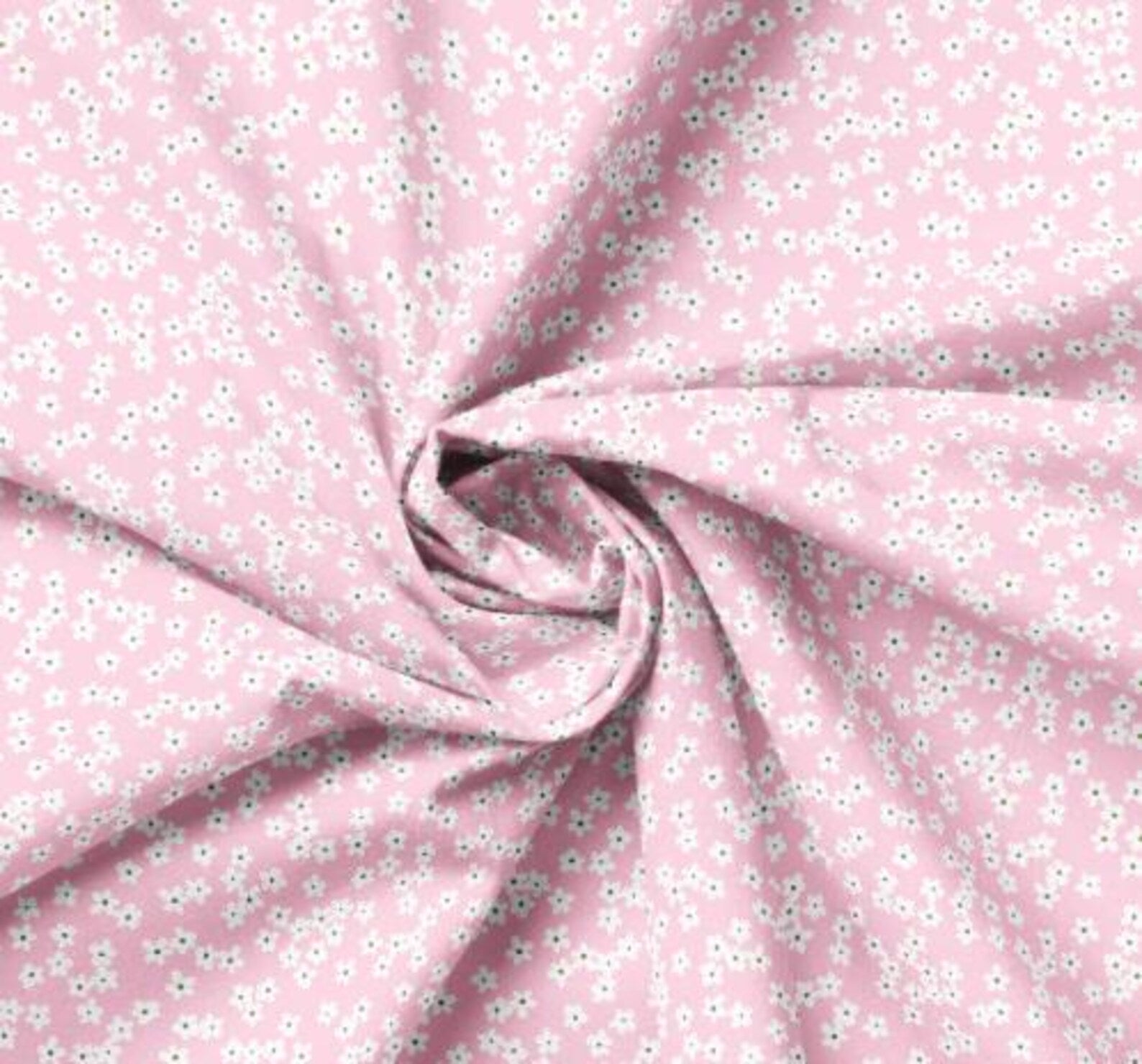 The Daisy and Lilly cotton fabric features soft pink floral designs with daisies, lilies, hearts, and plaid patterns. Its gentle pastel colors make it ideal for quilting and craft projects with a sweet, dreamy look.