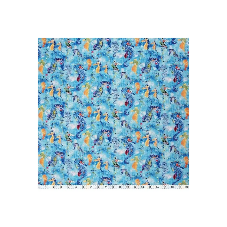 Fabric Creations, Blue with Colourful Watercolour Sea Horses (Sold By 1/2 Meter)