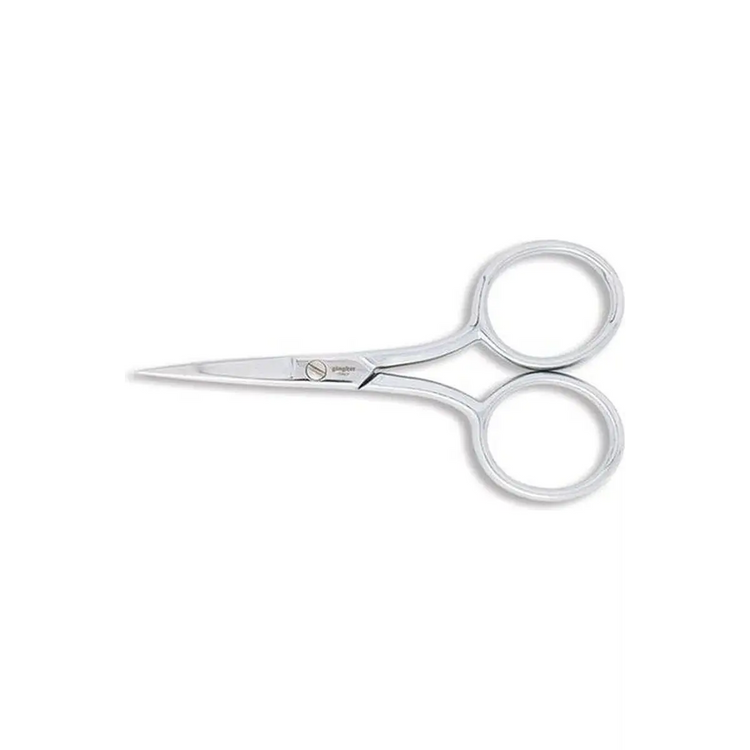 Gingher 4" embroidery scissors are a basic necessity for every sewing and needle arts enthusiast. Features a strong frame for cutting one layer of fabric or light-weight yarn. The sharp points reach and cut multiple threads. Includes leather sheath for storage. Double-plated chrome over nickel.