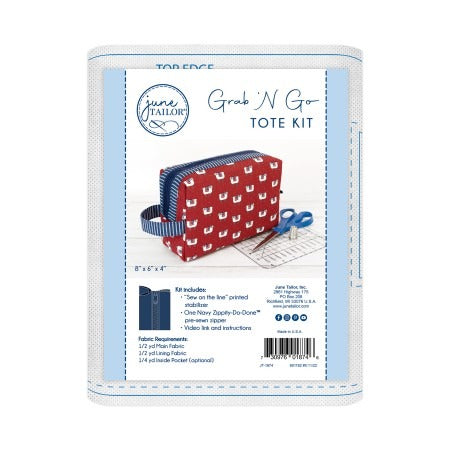 Sewing, school, craft or beauty supplies? This tote is made for any on-the-go storage and features an easy to carry handle as well as an optional interior pocket. Size: 8”W x 6”H x 4”D Kit Includes: Printed utility fabric for one tote, instructions with optional pocket, one Zippity-Do-Done™ pre-sewn zipper JT-1874 (Navy)
